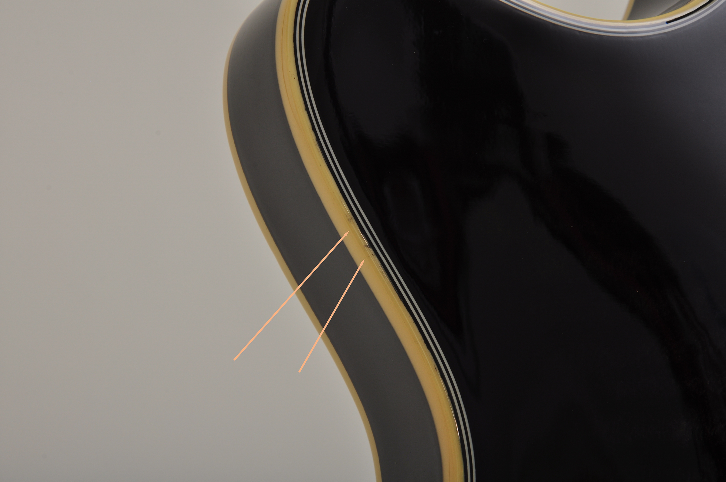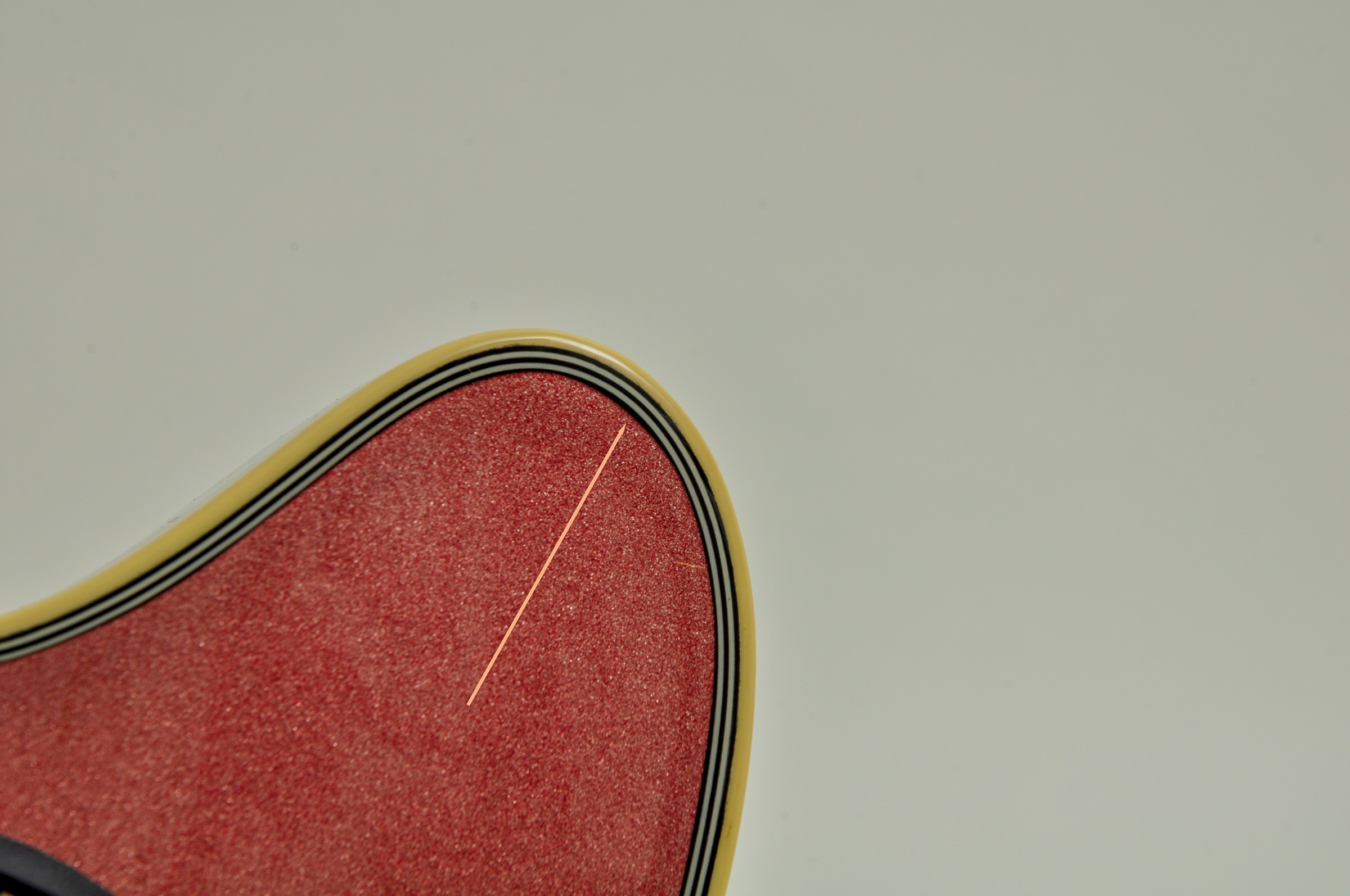 - Korpus: Fichte/Ahorn, semi-hollow mit Sustainblock, gebogenen Zargen, F-Loch